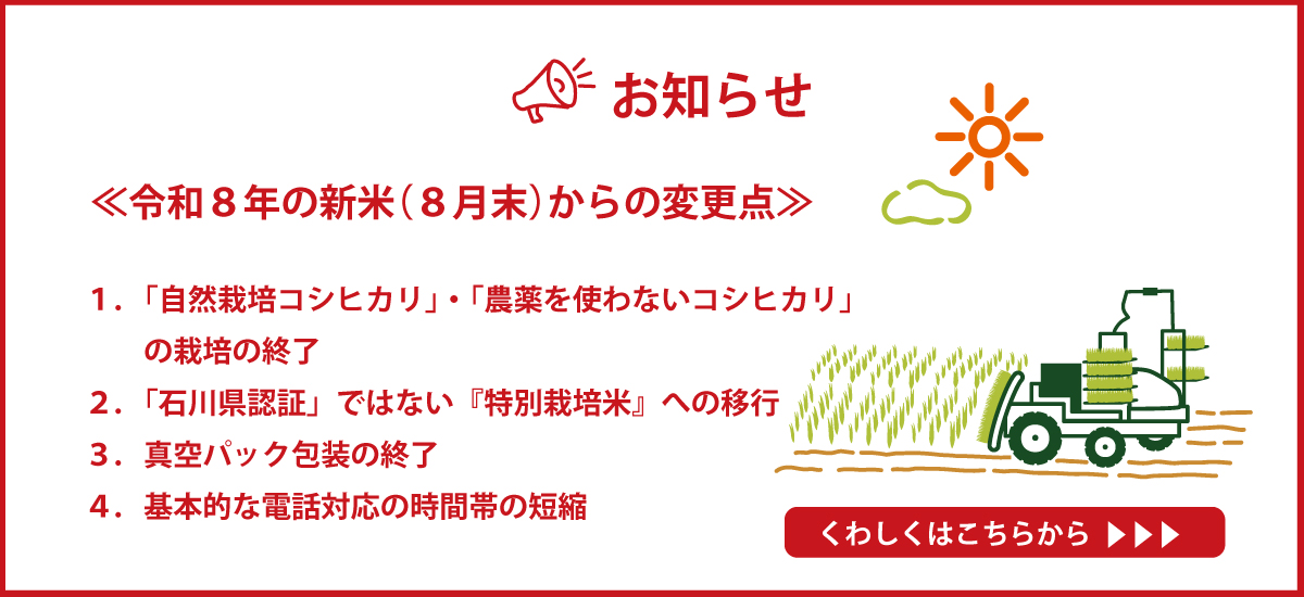つきましては、まことに不本意ではございますが、令和7年産米より、価格の改定をさせて頂くこととなりましたのでご案内申し上げます。お客様におかれましても物価上昇で大変な折、とても心苦しい限りですが、何卒ご理解賜りますようよろしくお願い申し上げます。